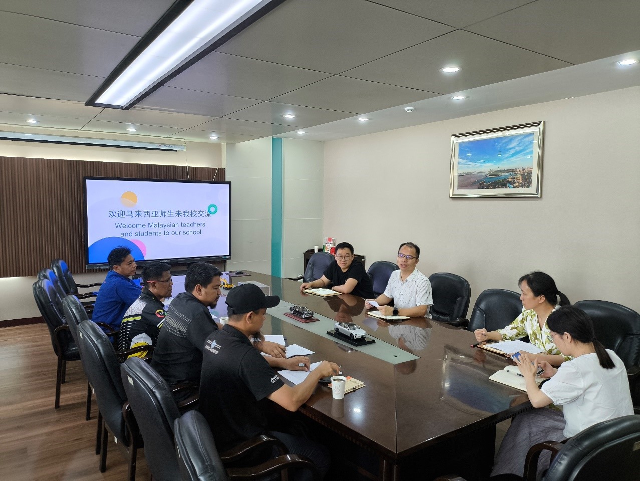 在探讨会上,双方就“深化中马职教合作,共育国际化技能人才”进行了讨论。首先,谢计红院长代表汽车学院再次表达了对于来自马来西亚苏丹米占再纳阿比丁理工学院29名师生的欢迎,并向他们进一步介绍了武汉交通职业学院汽车学院的办学理念和教学成果。经过深入探讨和充分交流,探讨会达成了以下几点共识:一是对于此次培训制定了更加详细的新能源汽车培训课程,使马来西亚师生能够更加全面地了解我国的新能源汽车行业;二是增加了企业参观活动(如岚图汽车、小鹏汽车等),让马来西亚师生切身体会我国先进的新能源汽车技术;三是双方将加强学术交流,通过共同开展学术会议以及共同发表文章,来促进双方在职业教育领域的深度合作。